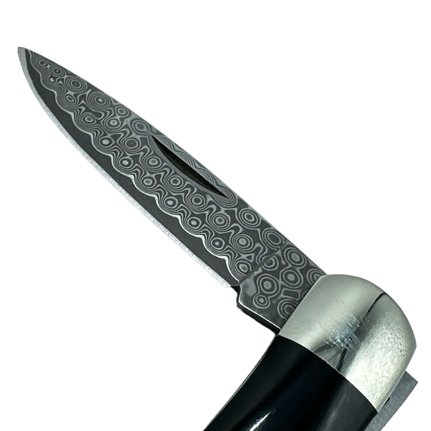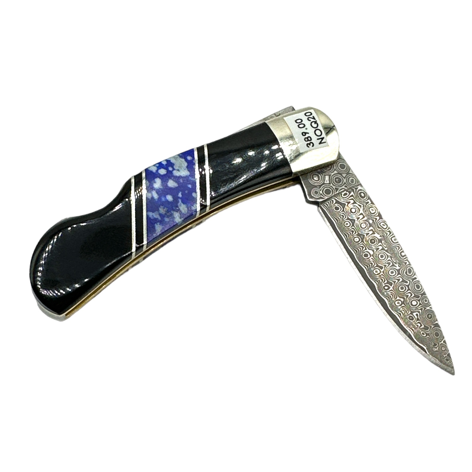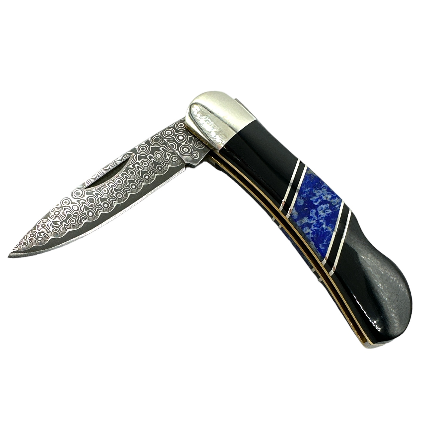 At 3″ closed, this nifty lockback folding knife is small enough to conveniently fit in your pocket. It measures 5-1/4″ in overall length with the 2-1/4″ “Sanmai Damascus” or Sandwich Damascus steel blade in the open locked position. The stainless steel frame/handle has been adorned with Jet and Lapis on both sides. It weighs a comfortable 57.5g.