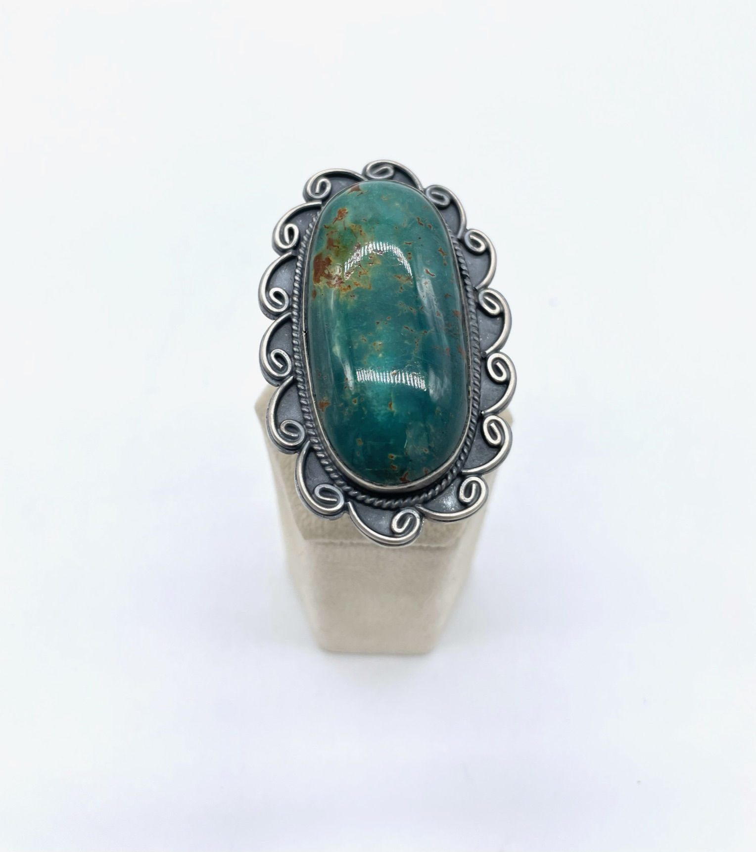 We are offering this wonderful Greg Perry designed Ring. Crafted from sterling silver and a handcut bezel set oval Green Kingman Turquoise, the ring is also adorned with traditional Native American metalwork surrounding the stone. This ring is adjustable and the size of the face is 1-1/4″ x 2-1/4″
