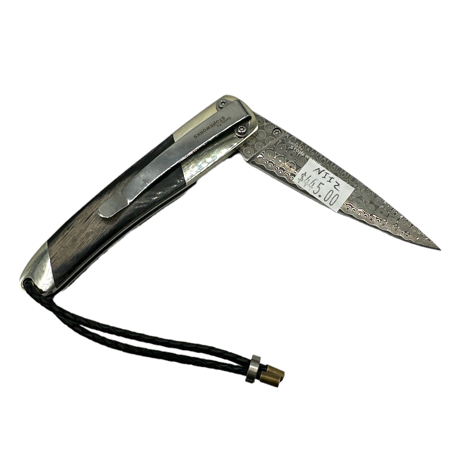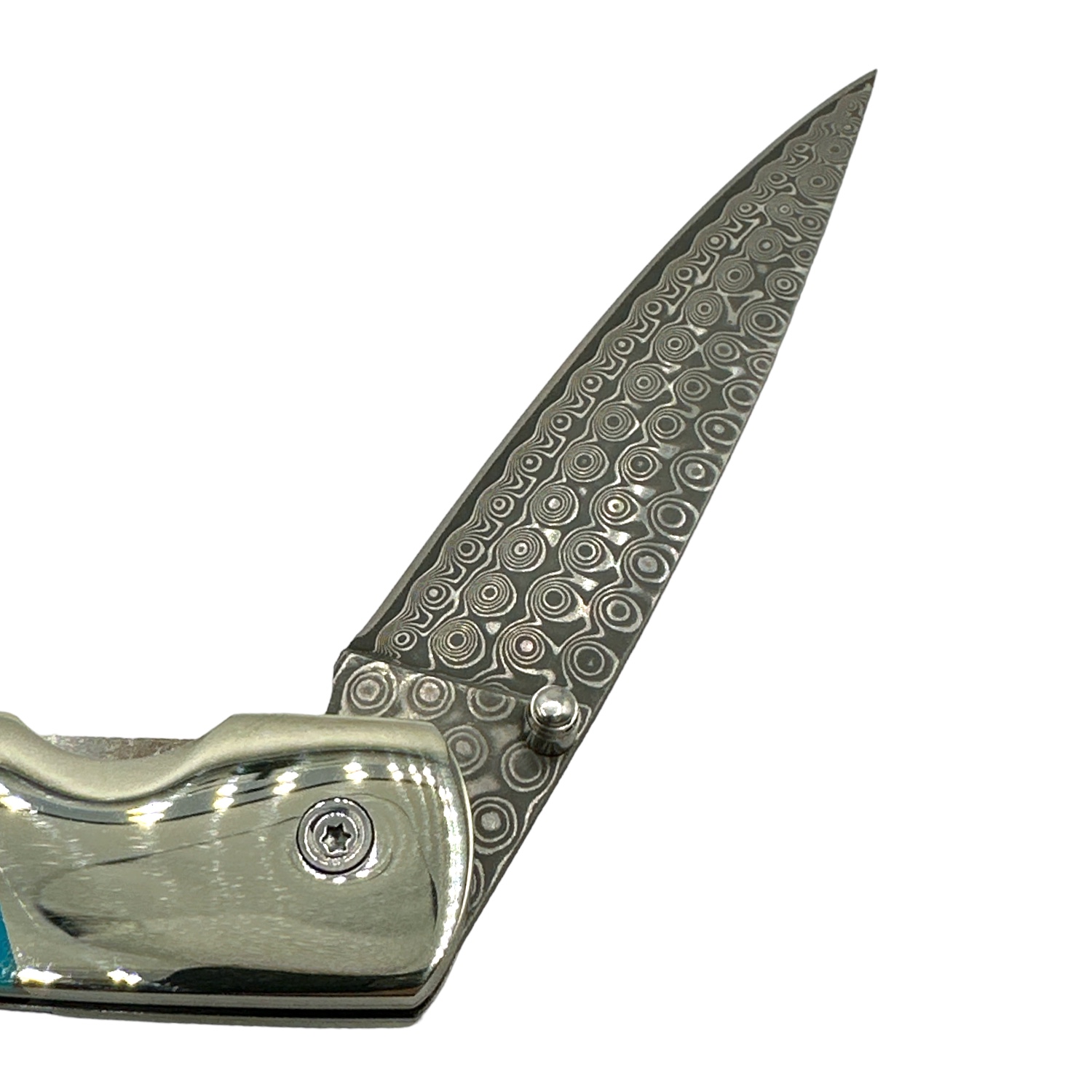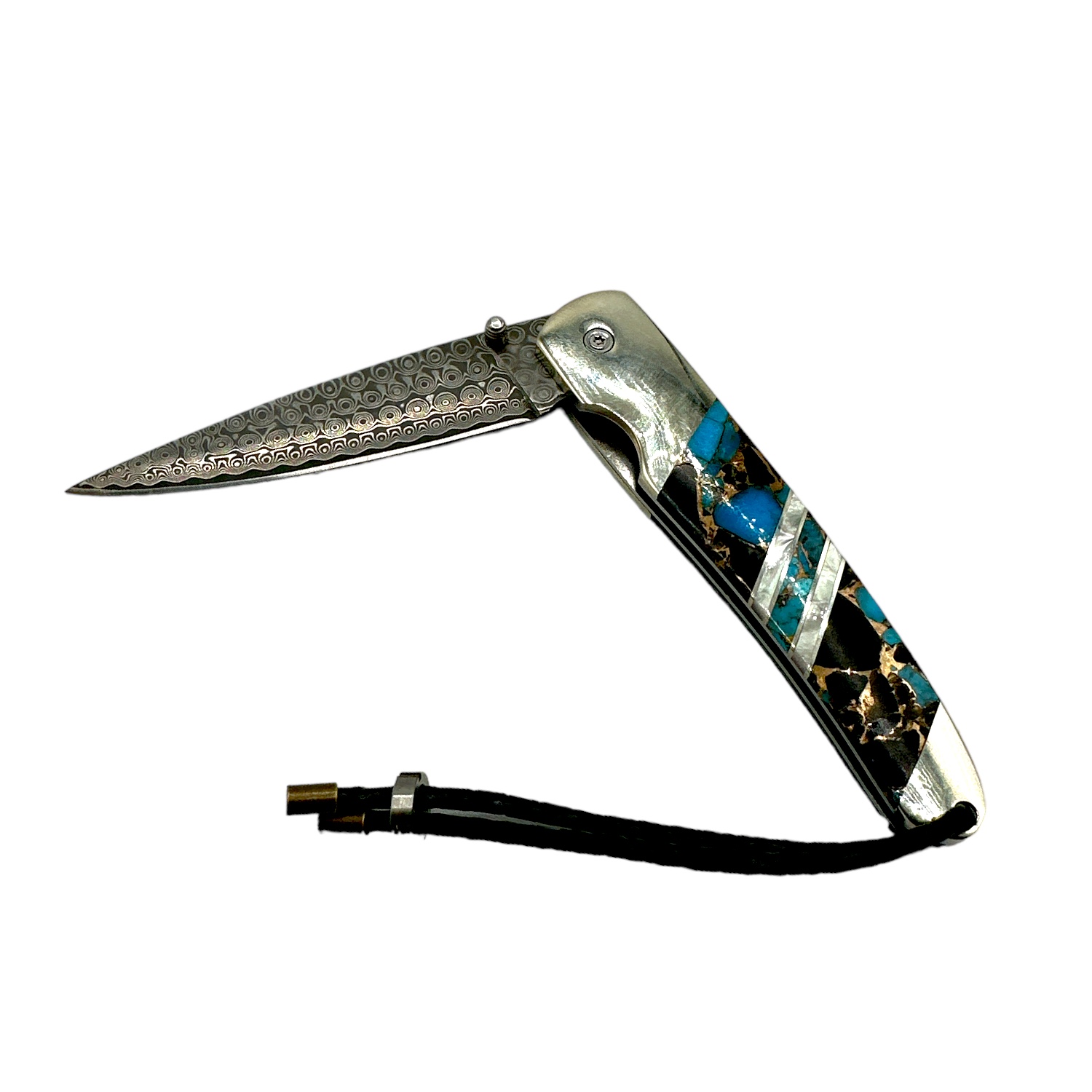 At 4″ closed, this nifty liner lock folding knife is small enough to conveniently fit in your pocket. It measures 7″ in overall length with the 3″ damascus steel blade in the open locked position. The stainless handle has been adorned with channel set MOP, Agate, Turquoise, & Wood on the other side. It also has a pocket clip and lanyard included. It weighs a comfortable 103.7g.