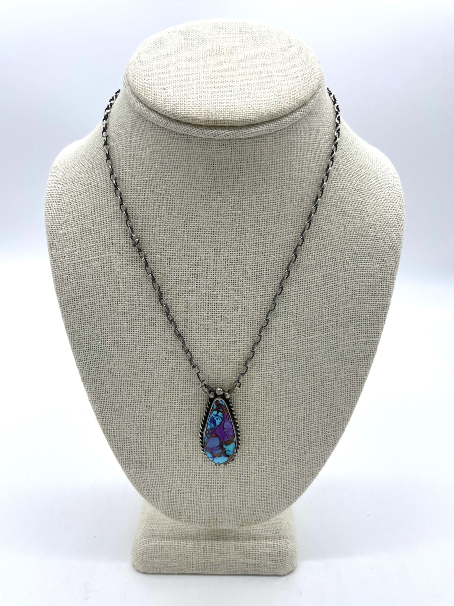 This stunning necklace was hand-crafted by Navajo jeweler Vernon Johnson. This teardrop shaped handcut oval genuine Purple Mojave Turquoise stone is set in a smooth bezel and is accented by traditional Navajo metal ropework. Included is the sterling silver 18″ oval link necklace.