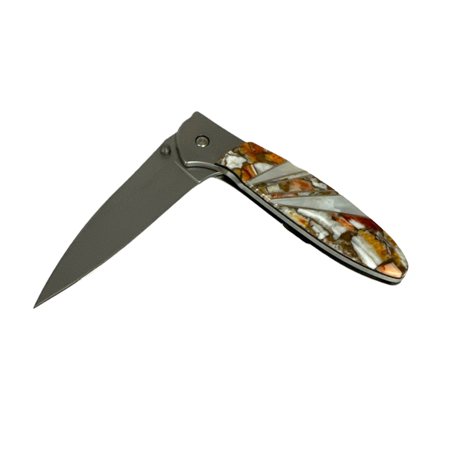 At 4″ closed, this Ken Onion Kershaw designed nifty liner lock assisted flipper folding knife is small enough to conveniently fit in your pocket. Measuring 7″ in overall length with the 3″ steel blade in the open locked position, the stainless handle has been adorned with channel set Mother Of Pearl & Agate on one side and has a tip-down pocket clip and safety lock. It has a small blade lock at end as well so it won’t open unexpectedly. It weighs a comfortable 101.1g. It also has a very convenient lanyard hole.