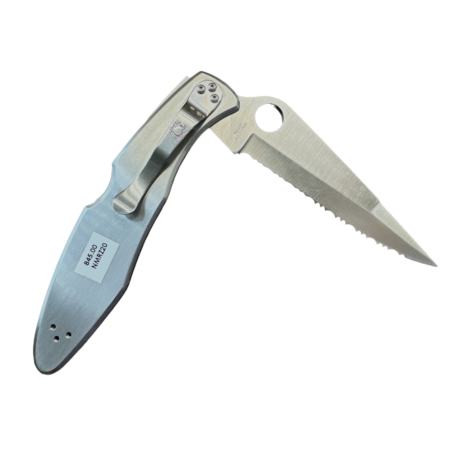 At 5.25″ closed, this Spyderco Custom Police Model VG10 nifty folding knife is able to comfortably fit in your pocket. Measuring 9.5″ in overall length with the 4.25″ serrated steel blade in the open locked position. The stainless handle has been adorned with channel set Spider Web Mother Of Pearl & Turquoise on one side and has a tip-down pocket clip and safety lock on the other. It weighs 168.2g.