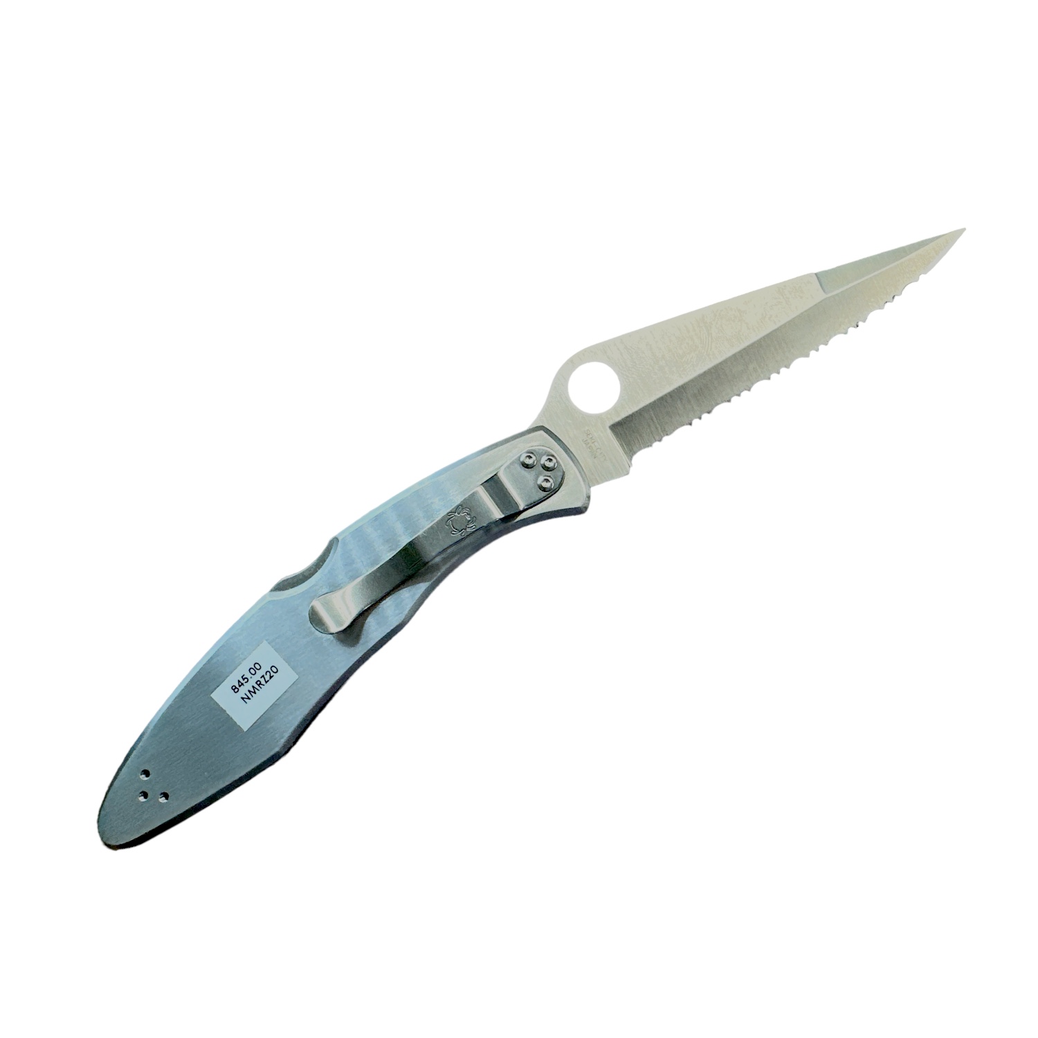 This Model has a David Bowe Dent cut out of the locking lever allowing you to gorilla grip the knife without accidentally releasing the lock. The blade is hollow-ground VG-10 and thick at the tip for added strength with a weight-reducing swedge along the spine. Spyderco Clip-its come with a round hole in the blade for one-handed opening, a clip on the back to securely attach the knife in your pocket or purse or as a money clip; and the famous SpyderEdge, a serrated knife blade that cuts like a saw.
