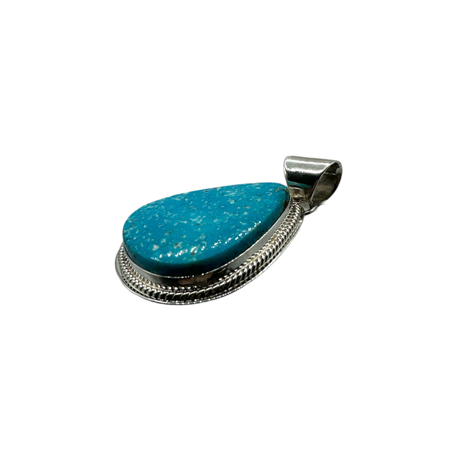 We are offering this wonderful pendant. Hand crafted from Sterling Silver, The pendant is adorned with a gorgeous teardrop handcut bezel set Kingman Turquoise stone. Accenting the stone is a halo of traditional Navajo sterling ropework. It measures 2″ x 1-3/8″ (bale included) and weighs 24 grams.