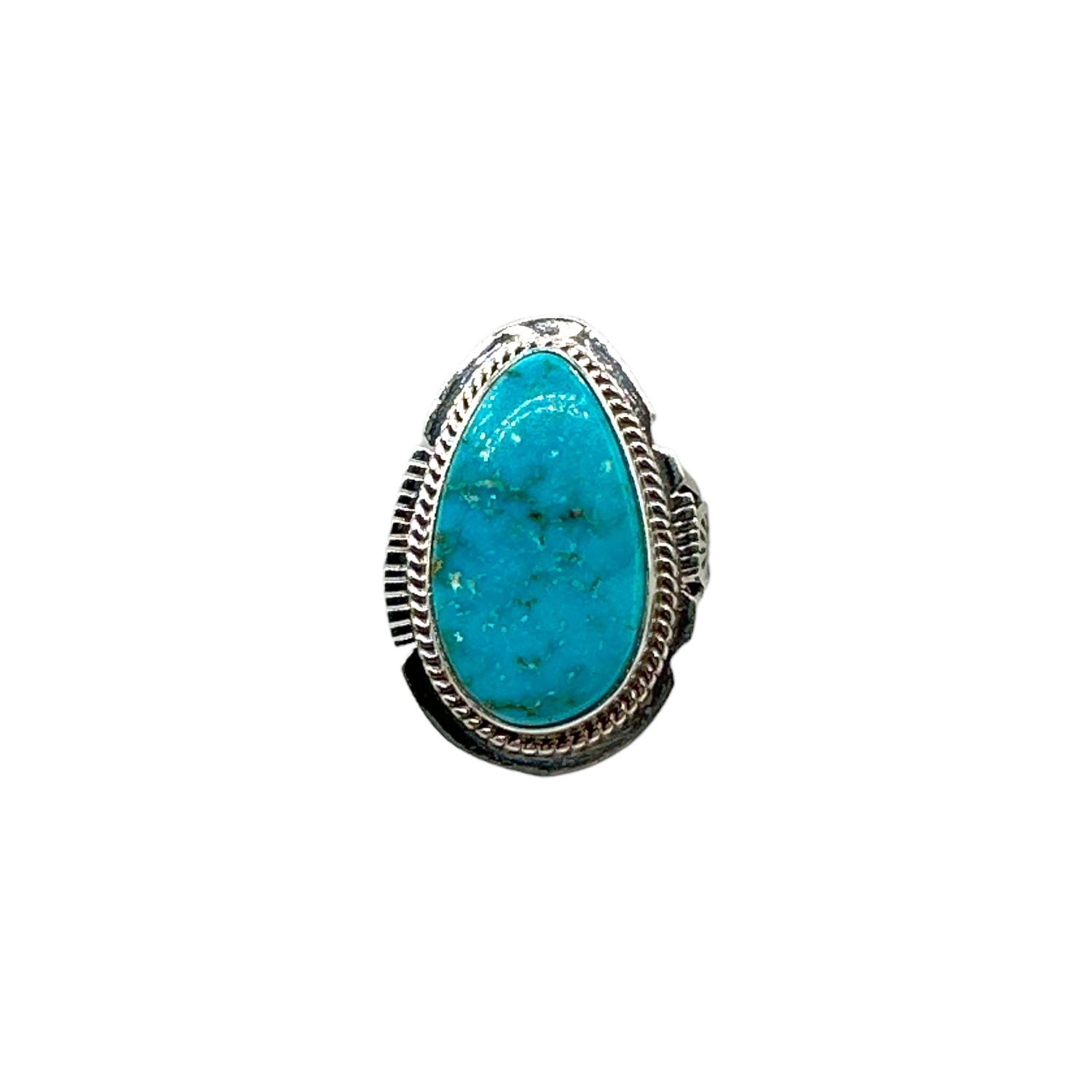 We are offering this simple and eye-catching handmade sterling silver ring. This quintuple-shank ring is adorned with a handcut Kingman Turquoise stone in a smooth bezel setting accented by traditional Navajo sterling twisted ropework. The face of the ring measures 15/16″ x 3/8″ . It is a size 8.25 and weighs 7.3 grams.