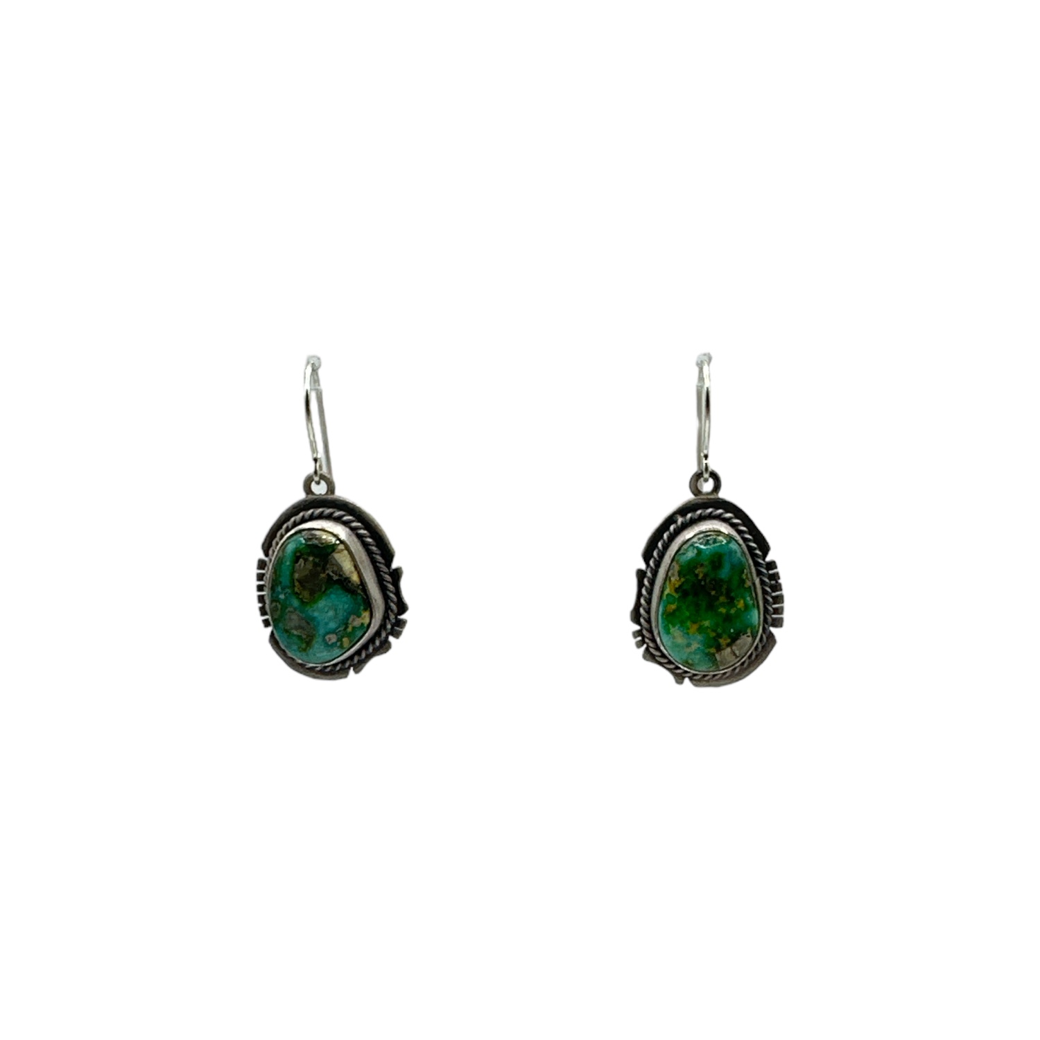 We are offering these beautiful Navajo Dangle Earrings. Both earrings consist of a gorgeous hand-cut Oval Sonoran Hills Turquoise gemstone accented by a halo of traditional Native American metalwork. Each earring has a drop length of 1-1/2″ and are 3/8″ wide. They have a combined weight of 11 grams. They have a fishhook closure.